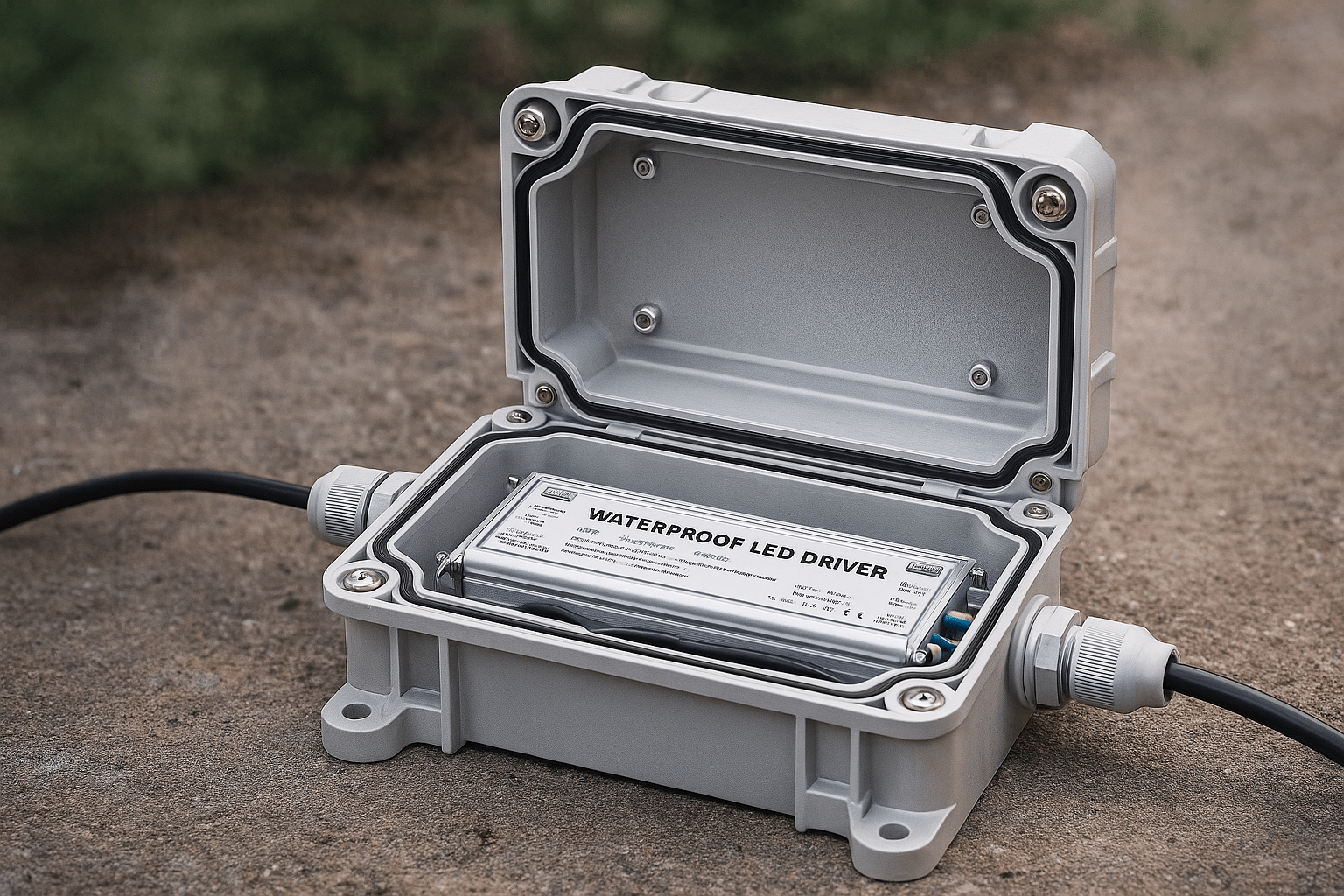 (Hình hộp kỹ thuật ngoài trời đang chứa driver chống nước, có gioăng cao su bảo vệ)